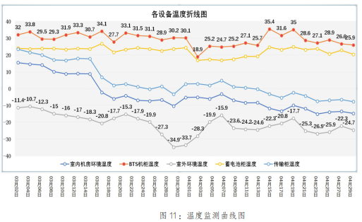 在呼倫貝爾東能化工基站進(jìn)行現(xiàn)場(chǎng)測(cè)試,在每個(gè)主設(shè)備、電池柜、機(jī)房?jī)?nèi)、機(jī)房外安裝溫度傳感器,實(shí)時(shí)檢測(cè)溫度情況。經(jīng)反復(fù)調(diào)試、測(cè)試數(shù)據(jù)搜集及分析跟蹤,節(jié)能效果顯著。
