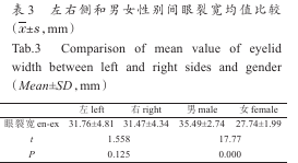 內(nèi)蒙古地區(qū)蒙古族青年大學生面部測量7項指標 結(jié) 果 見 表1,內(nèi)蒙 古 地 區(qū) 蒙 古 族 青 年 大 學 生 鼻 部 、唇 部 測 量 結(jié) 果 見 表2,眼裂 寬 左 右 側(cè) 別 、男 女 性 別 均值 比 較 見 表3,對比 左 右 側(cè) 眼 裂 寬P>0.05,差異 無 統(tǒng)計學意義;對比男女眼裂寬P<0.05,差異有統(tǒng)計學意義。