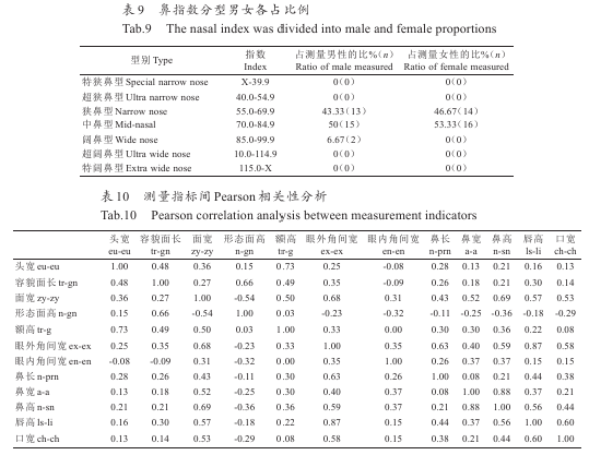 Pearson相關(guān)性分析容 貌 面 長-形態(tài) 面 高 、眼 外 角 間 寬-形態(tài) 面 高 、鼻寬-形態(tài) 面 高 、眼 外 角 間 寬-鼻高 、眼 外 角 間 寬-唇高 、鼻 長-鼻 高 成 正 相 關(guān) ,r在0.7~0.9范 圍 內(nèi) ,高 度 相 關(guān)(表10)。
