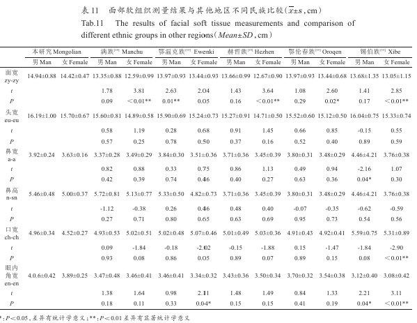 不同面形面部輪廓差異體現(xiàn)在多個方面,眼部、鼻部、唇部的不同都會影響整體的面部和諧程度,本次研究將年齡、性別、民族納入研究標準,有研究[11]結(jié)果表示1%的人擁有面部水平劃分為三等份時三部分都相等的面容,古典的審美標準并不適用于該地區(qū),另外45.5%的受試者的右眼瞼寬度大于左眼瞼寬度,本研究對比左右眼裂寬,內(nèi)蒙古蒙古族青年大學生眼部 對 稱 性 良 好 。 有 研 究 顯 示 ,亞 美 人 種 面 寬 值131~145 mm[6],本文測量內(nèi)蒙古地區(qū)蒙古族青年大學生面寬131~158 mm,已經(jīng)超出上限值。Sim[13]等人測量比較了中國南方婦女與類似報道的北美白人女性面部進 行 比 較 ,研 究 結(jié) 果 顯 示 中 國 南 方 婦 女 鼻 翼 寬 度 更寬、鼻基底部更寬、鼻部并不突出、鼻尖不清晰、鼻翼更突出、鼻孔偏水平,少有寬厚的嘴唇。本研究統(tǒng)計口寬遠遠小于1.5倍的鼻寬,四分之一的面寬小于鼻寬 ,Farkas等[14]研 究 發(fā) 現(xiàn) 大 多 數(shù) 白 種 人(60.2%)口 寬大于1.5倍的鼻寬,考慮引起差異的原因是白種人唇部寬度較大,而內(nèi)蒙古地區(qū)蒙古族青年大學生的唇部寬度較小,鼻部寬度較大。種族之間審美目標不同,整形手術(shù)時需要注意保留原有面部種族的特征和外觀。在整形美容、顏面部修復時,要注意不同民族之間的差異性之間的差異化設(shè)計。查閱相關(guān)面部測量文 獻 ,與 劉 小 元 等[15]測 量 平 均 年 齡 在( 38. 63±13. 75)歲的滿通古斯族人群進行六項指標對比,與滿族、赫哲 族 、鄂 倫 春 族 、錫 伯 族 測 量 面 寬 相 比 ,女 性t=3.81,P<0.00;t=3.64,P<0.00;t=2.60,P=0.02;t=2.85,P<0.00,差異 有 統(tǒng) 計 學 意 義 。 蒙 古 族 女 性 面 寬 大 于 滿族、赫哲族、鄂倫春族、錫伯族。對比蒙古族面寬與鄂溫 克 族 之 間 ,男 性t=2.63,P=0.01,差異 有 統(tǒng) 計 學 意義,蒙古族男性面寬大于鄂溫克族。與滿族、赫哲族、鄂倫春族、錫伯族相比P>0.05,差異無統(tǒng)計學意義,男性面寬相近。對比錫伯族男性鼻寬,男性t=-2.16,P=0.04,差異 有 統(tǒng) 計 學 意 義 ,蒙 古 族 男 性 鼻 寬 小 于 錫 伯族。對比蒙古族口寬與錫伯族之間,女性t=-2.90,P<0.00,差異 有 統(tǒng) 計 學 意 義 ,蒙 古 族 女 性 口 寬 小 于 錫 伯族 。 對 比 蒙 古 族 眼 內(nèi) 角 間 寬 與 錫 伯 族 之 間 ,男 性t=2.21,P=0.04,女性t=3.11,P<0.01,差異 有 統(tǒng) 計 學 意義,蒙古族兩性眼內(nèi)角間寬均大于錫伯族(表11)。
