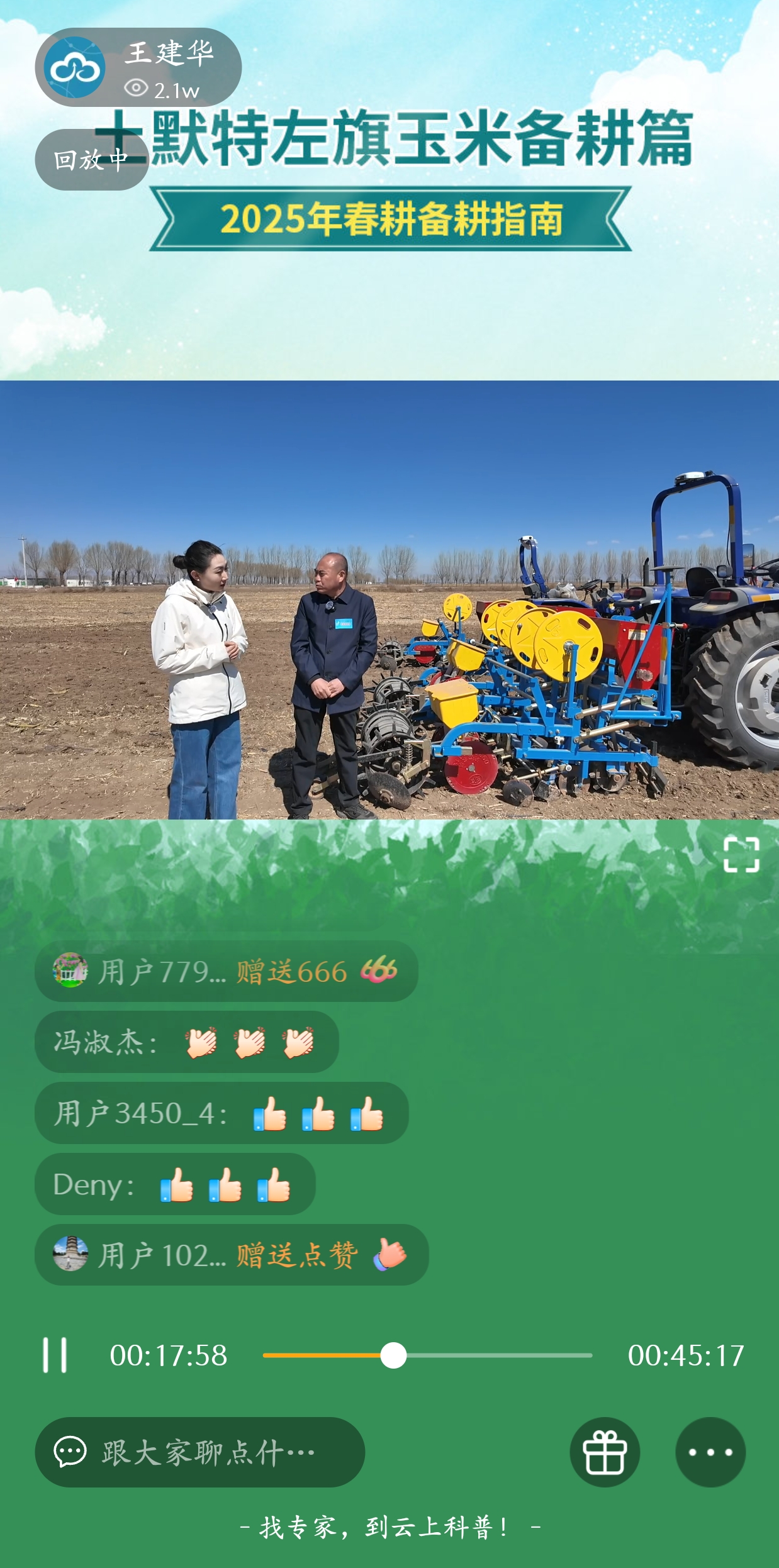 為精準服務(wù)內(nèi)蒙古地區(qū)春耕生產(chǎn),3月31日上午11時,由內(nèi)蒙古科協(xié)聯(lián)合農(nóng)牧廳共同主辦的“2025年內(nèi)蒙古春耕備耕指南——土默特左旗玉米備耕篇”戶外直播活動,通過“云上科普”平臺及“蒙農(nóng)創(chuàng)”視頻號同步播出?;顒泳劢褂衩追N植關(guān)鍵技術(shù),以“專家講解+現(xiàn)場互動”形式,為當?shù)剞r(nóng)民送上“春耕及時雨”,直播瀏覽量突破2.1萬人次,社會反響良好。